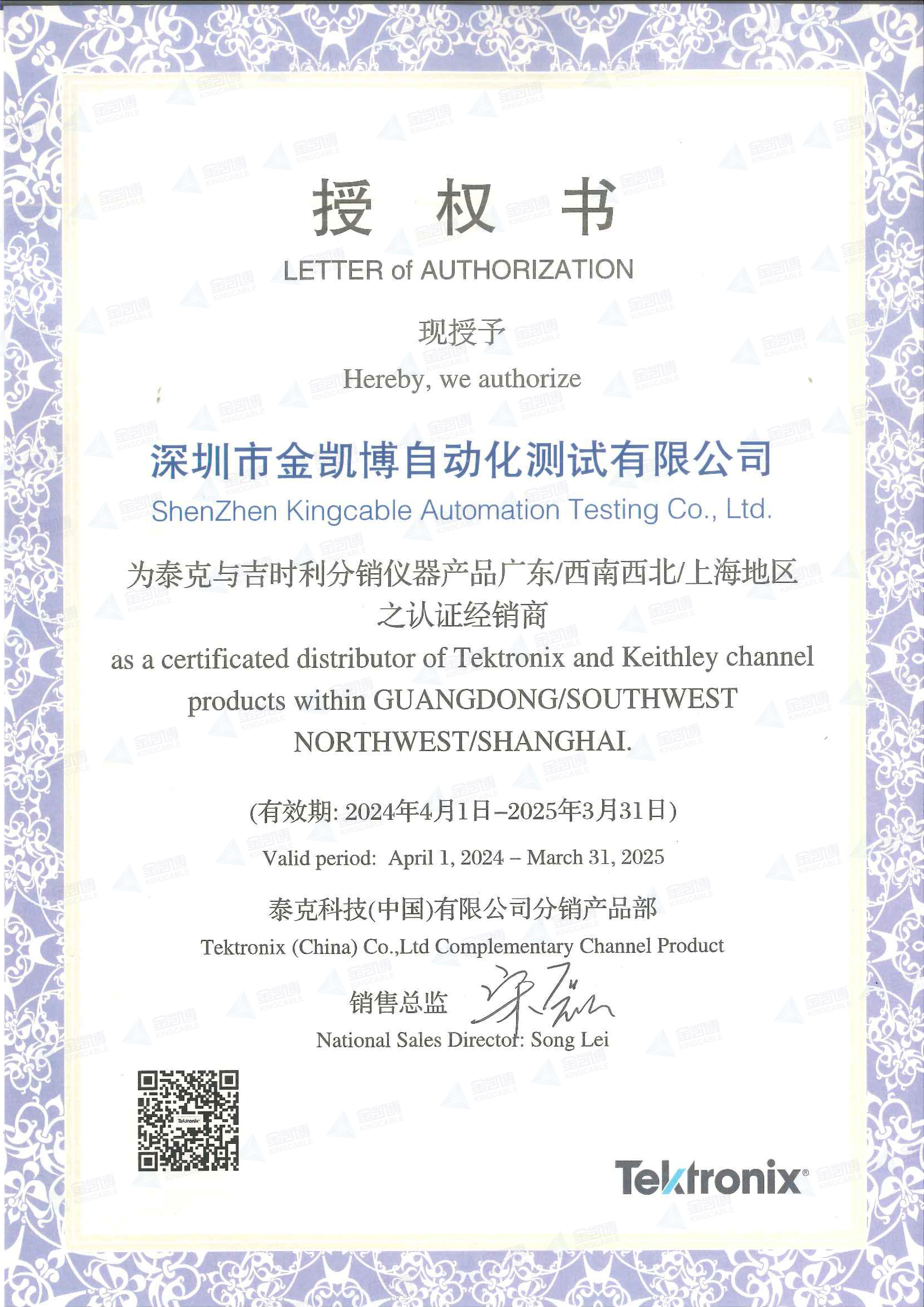 泰克吉时利授权书