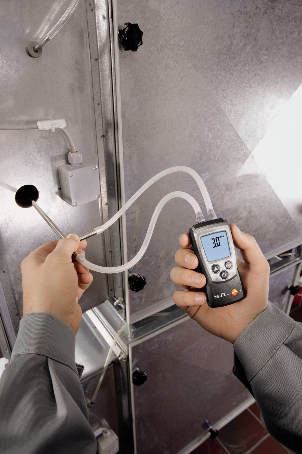 testo 510 迷你型差压测量仪适用于空调系统中 0~100 hPa 的差压测量。选配皮托管可实现通风管道中的风速测量,量程10~100 m/s。以下10种内置测量单位可供选择: